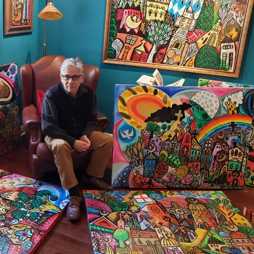 Experience a series of monumental cityscapes by renowned Irish painter Brian Whelan depicting Christianity, Islam, and Judaism coexisting in harmony. Rendered in bright colors and playful shapes, the works represent an “aspirational vision of what a holy city looks like” — an uplifting image of cultural unity.