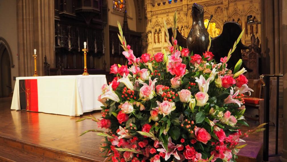 Although Trinity Church Wall Street is customarily low-key about observing Laetare Sunday, if you watch the online Holy Eucharist on Sunday at 11:15am EDT, you will notice a floral arrangement that will feature the colors rose or pink. And please note that Daylight Saving Time begins Sunday at 2am so be sure to re-set your clocks so you can tune in to Trinity's online worship on time.