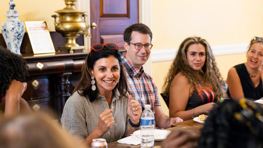 Beatriz de la Torre, Chief Philanthropy Officer, speaks at a meeting while seated around a table with other participants