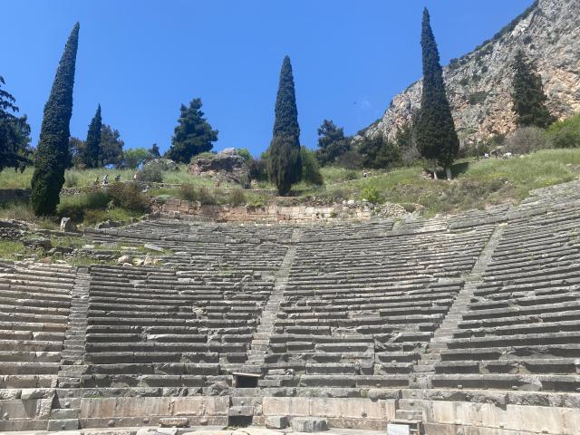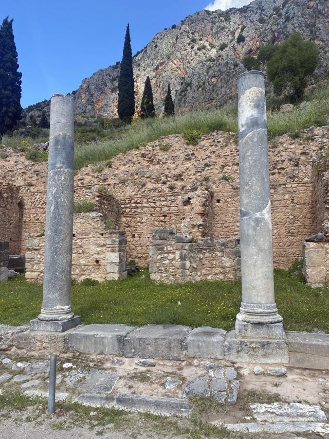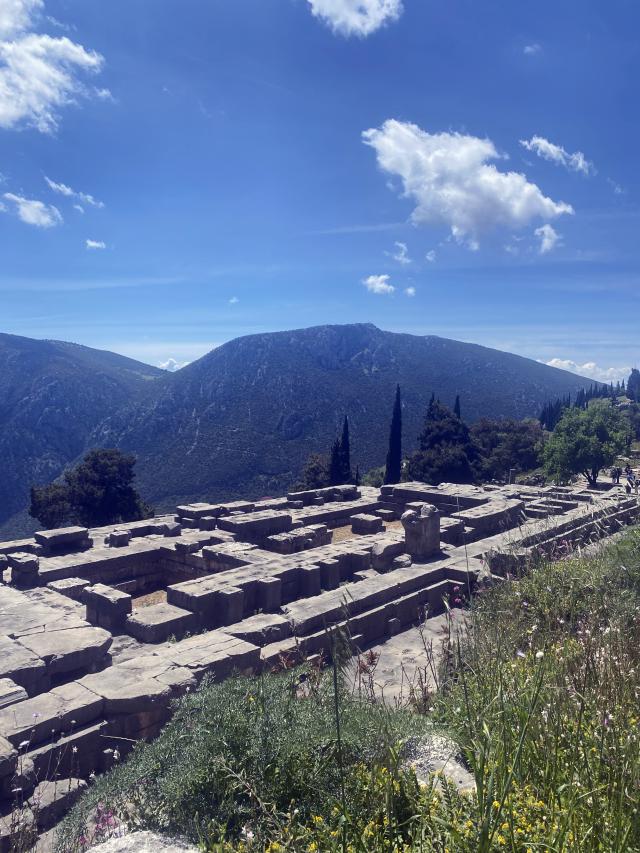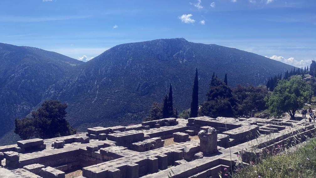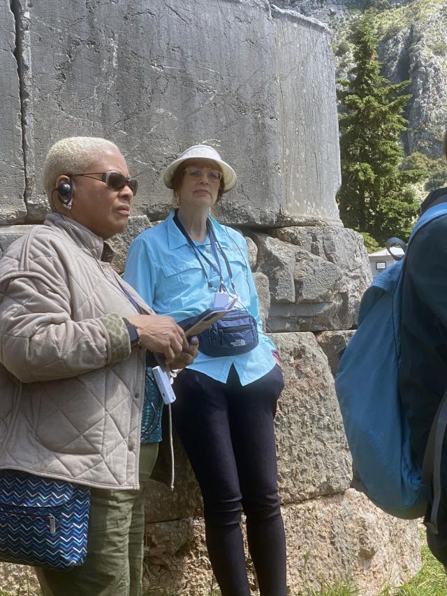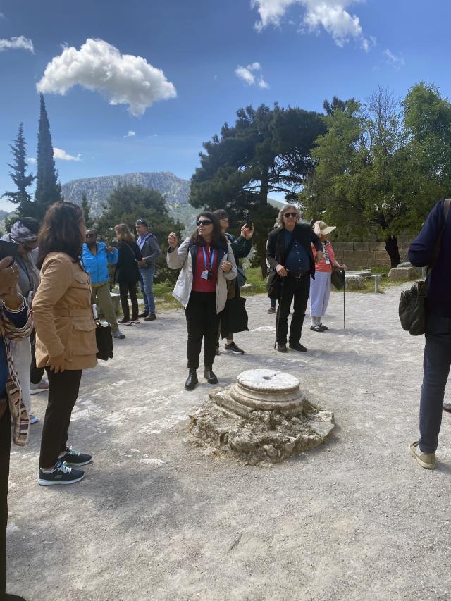 Our guide in Greece, Zina tells the group about the ruins of the Agora—or market—at ancient Delphi.