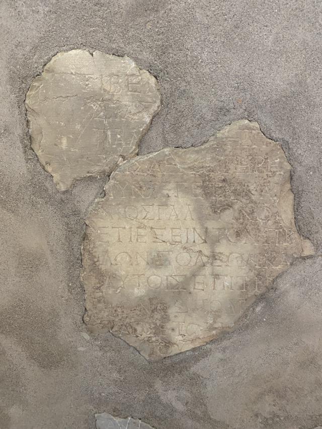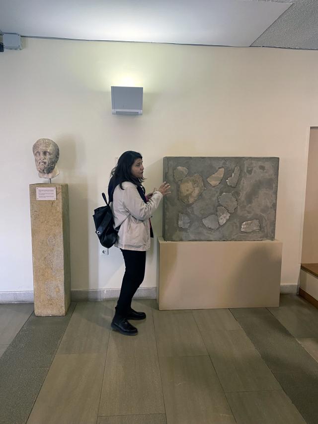Our guide Zina shows the Trinity Pilgrims the ancient inscription noting Gallio, the Roman official who dismissed charges against the apostle Paul as mentioned in Acts 18.