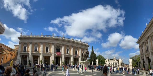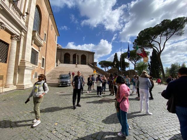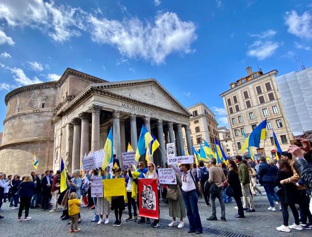 Trinity Pilgrims encounter anti-fascist demonstrators at the Pantheon in Rome. Prayers for Ukraine.