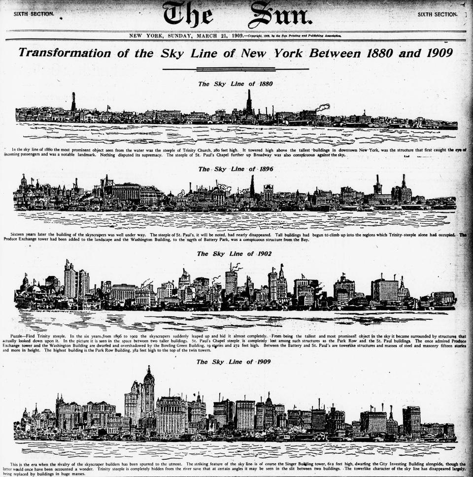 With its 281-foot steeple, the third Trinity Church became the tallest building in the United States. It held that distinction for over two decades, until it was surpassed by St. Michael’s Church in Chicago in 1869. Trinity Church continued to tower over New York City’s skyline until 1890, when “The World Building,” the 309-foot home of the New York World newspaper, temporarily claimed the title of the city’s tallest building.