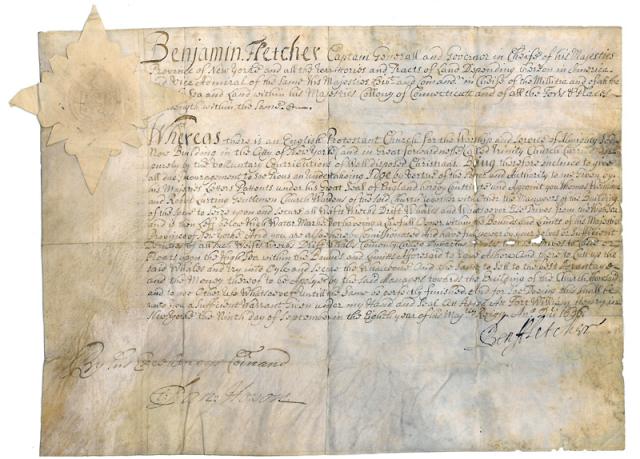 Like the leaders of any new church, Trinity’s early vestry members struggled to raise funds for their parish. In 1696, the colonial governor of New York, Benjamin Fletcher, granted a patent declaring that all shipwrecks and drift whales that washed ashore in New York Harbor would become the property of Trinity Church. Whales and shipwrecks were a considerable source of income at the time. Whales were used for a variety of valuable products, from lamp oil to corset stays. And shipwrecks would provide access to whatever goods were on the boats.