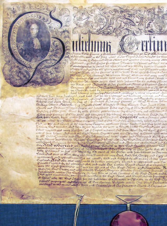 Before Trinity could become the first official Anglican church on the island of Manhattan, we needed permission from the crown to exist. King William III granted Trinity Church its charter in 1697, and we’ve kept it safe ever since. The original four-page document is preserved in a temperature-controlled vault in Trinity’s Archives. It was written in English — rare for the time, since most official documents were written in Latin or French. The charter came with an elaborate sketch of King William III and the king’s official red seal. The seal has degraded over the past three centuries, but the missing areas have been patched over with wax.