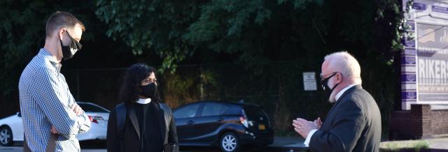 Neill Coleman, the Rev. Winnie Varghese, and Bishop Dietsche at the Faith Communities for Just Reentry launch near Rikers Island in July 2020.