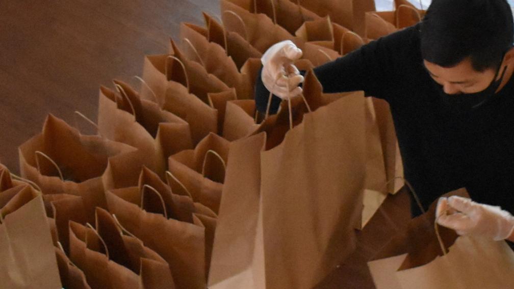 Observing social distancing along with other Trinity staff, Summerlee Staten, Executive Assistant to the Priest-in-charge and Vicar, packs bags for the Compassion Market.