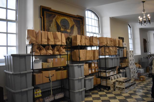 Bags of food at St. Paul's Chapel are stored in front of a painting of the Great Seal of the United States, commissioned in 1785.
