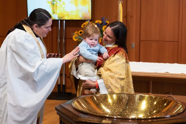 In all four cases, the Rev. Kristin Kaulbach Miles and the Rev. Elizabeth Blunt teamed up to complete the sacred ritual, pouring the water of baptism over the child and then marking the forehead with holy oil. Then Mother Kristin asked the congregation: